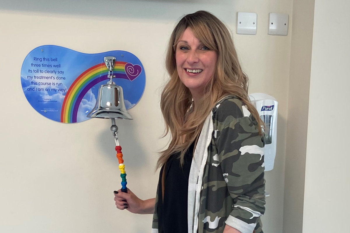 To mark the end of her treatment and the start of the next part of her life, Sarah “rang the bell” (see top photo) at Castle Hill Hospital near Hull on 13 May 2022.